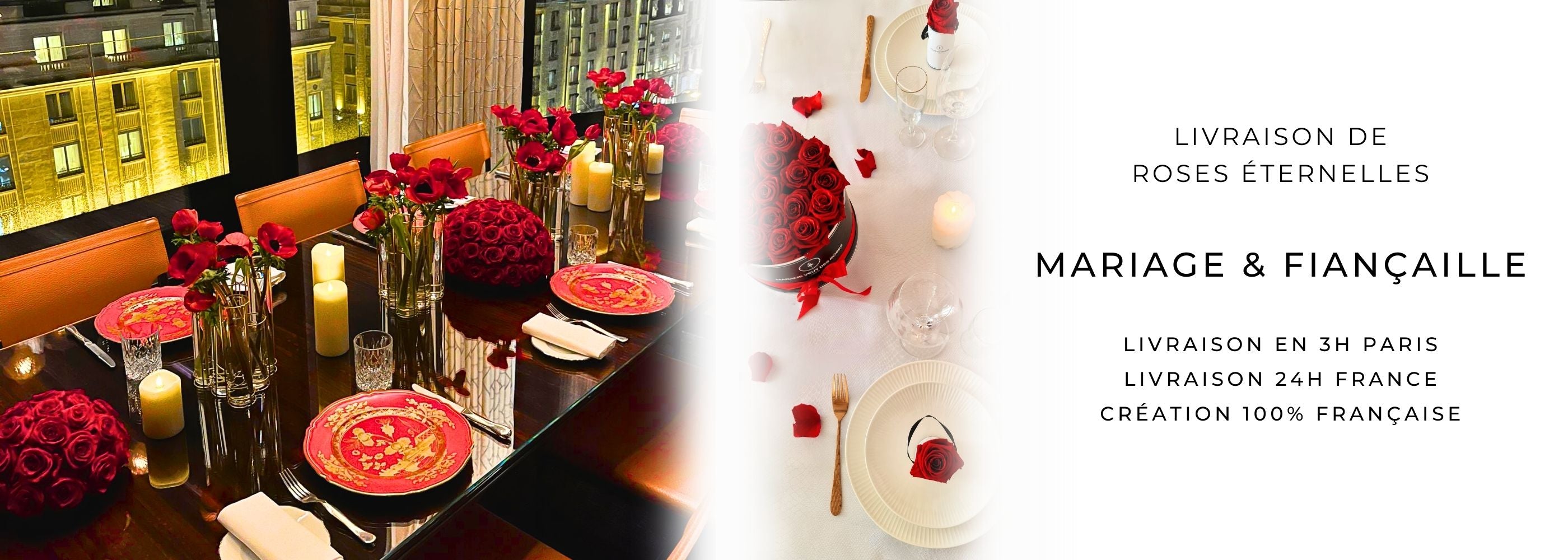 Êtes-vous à la recherche d’un cadeau pour votre mariage ? Cette page est faite pour vous ! Des roses éternelles à un mariage : c’est un rituel ! Ce n’est un secret pour personne. La rose éternelle est l’emblème incontestable de l’amour, du romantisme et de la passion amoureuse, elle est indispensable à un mariage. Avoir la présence de roses éternelles à un mariage est devenu un rituel au fil du temps. Symbole de l’amour éternel, les roses éternelles ont un rôle majeur lors d’un mariage : elles vous permettront de sceller votre union. En complément de votre mariage, c’est l'occasion rêvée de montrer tout l’amour que vous ressentez pour votre âme sœur tout en vivant une expérience inoubliable aux côtés de vos proches. Grâce à nos services de livraison express de roses éternelles, offrez l'éternité de nos roses éternelles à votre âme sœur !