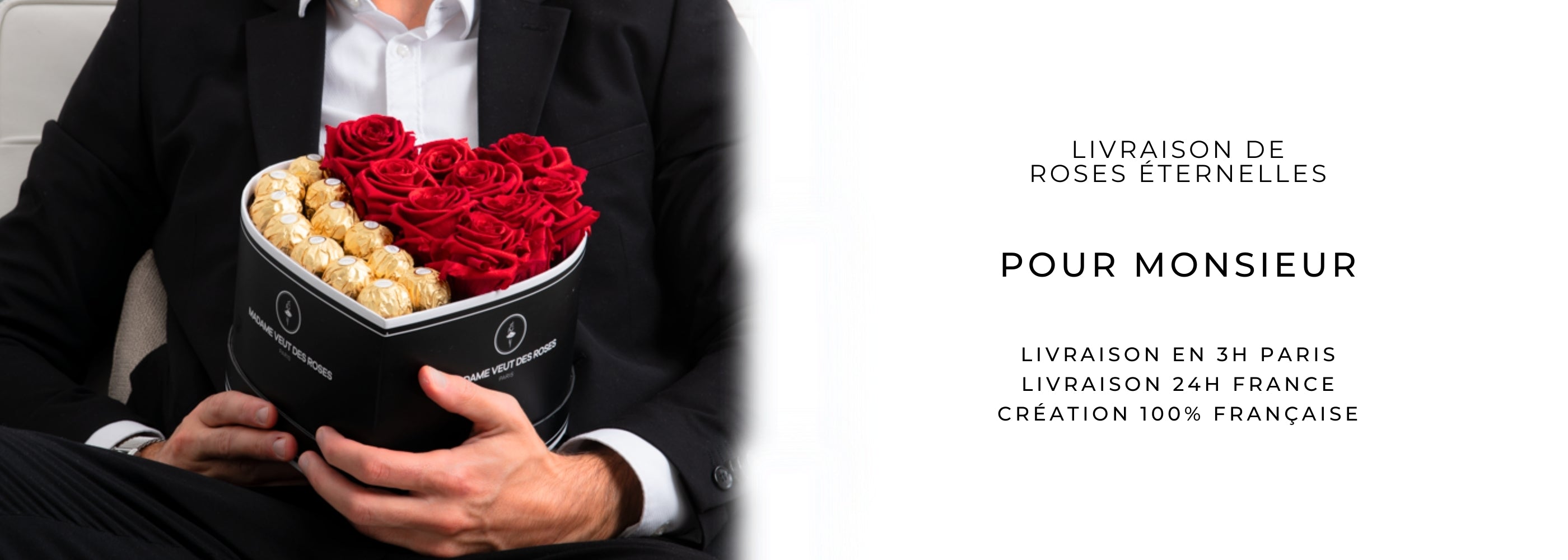Pour combler le cœur de votre homme, vous pouvez offrir nos coffrets de nos roses éternelles à différentes occasions, un cadeau fête des pères, un cadeau Saint Valentin, un cadeau anniversaire. Toutes les occasions sont les bienvenues pour offrir des roses éternelles aux hommes de votre vie. Pour la fête des pères, nos coffrets de roses éternelles seront le cadeau idéal pour témoigner votre reconnaissance à votre père et pour le remercier de l’amour protecteur et paternel qu'il vous apporte au quotidien. Pour la Saint-Valentin, sortez de l’ordinaire en bénéficiant de nos coffrets de roses éternelles. Plus que des mots, plus qu’un simple cadeau, offrez l’éternité de nos roses éternelles à l’homme de votre vie. Ce n’est un secret pour personne, les roses éternelles semblent être le cadeau idéal pour votre homme. Grâce à nos services de livraison express de roses éternelles, vous avez l’opportunité d’illuminer la journée de l’homme de votre vie ! Grâce à nos fleurs éternelles, exprimez vos sentiments et votre amour passionnel à votre chéri.