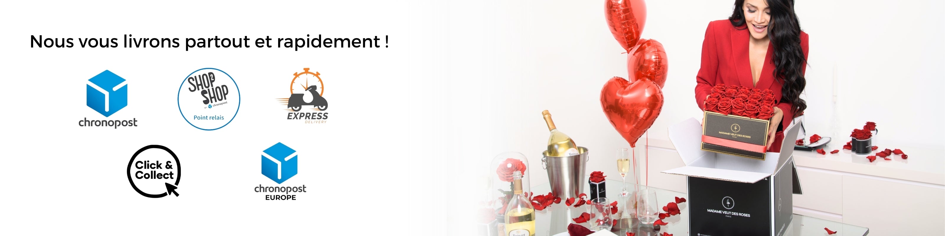 Madame Veut Des Roses confectionne ses créations à la main en France, dans son atelier parisien. Alors que vous soyez près de nous en région Parisienne ou bien dans une autre ville n'importe où en France, votre box de roses éternelles sera livrée auprès de son destinataire dans les plus brefs délais.